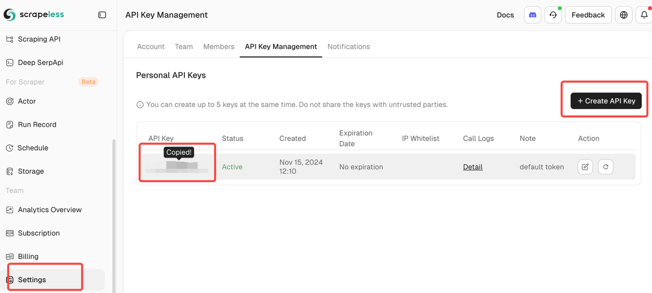 - Scrapeless API Key: Please sign up for a Scrapeless account. Once registered, you can access your API key from the dashboard.