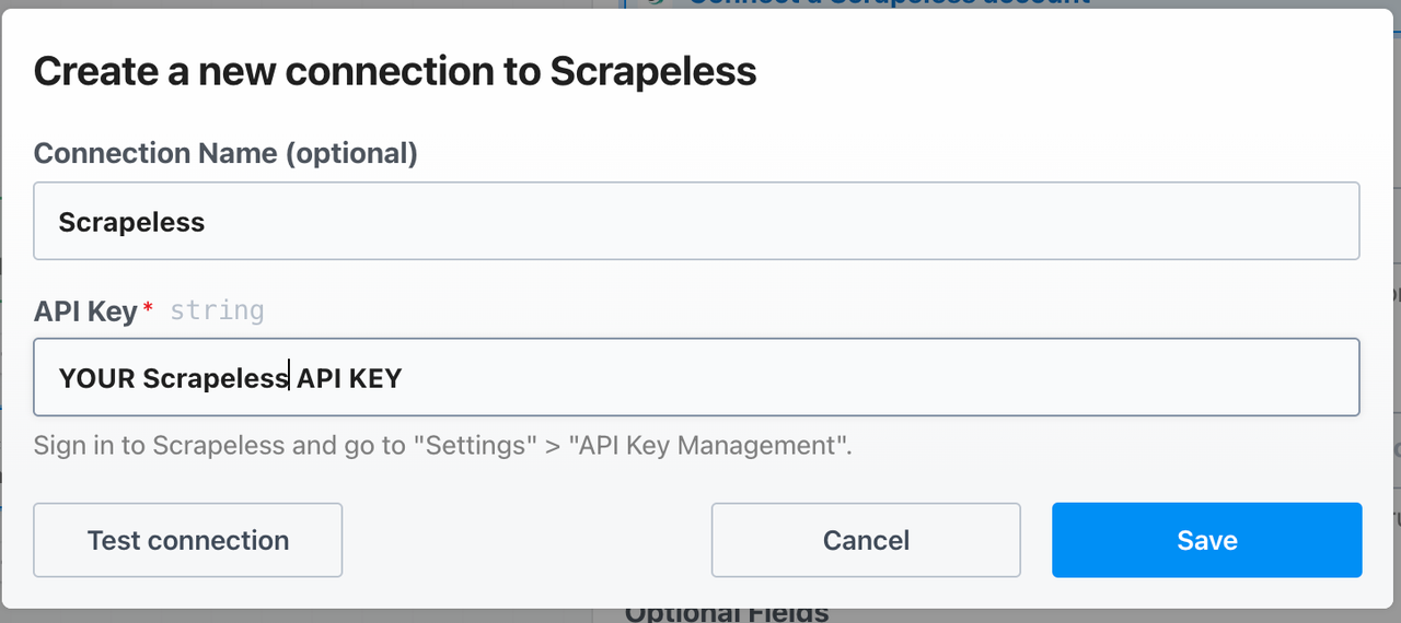 You need to log in to your Scrapeless account and go to the dashboard to obtain your API key. Once you have it, go to the “Accounts” tab in Pipedream and add the key there, as shown below: