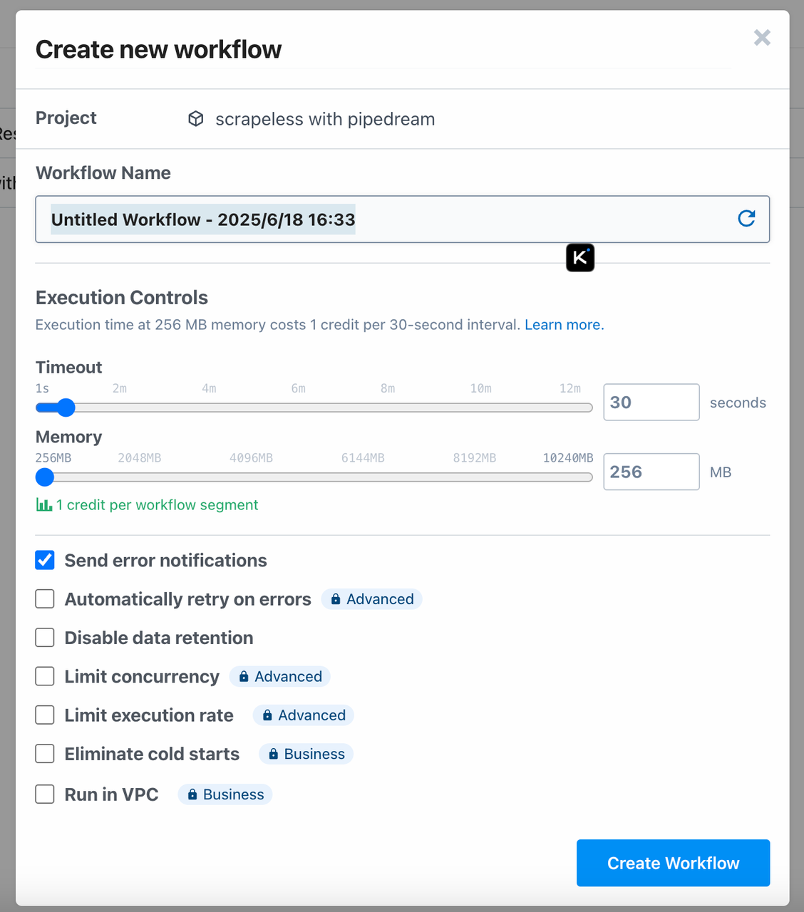 We’ll use Pipedream’s Scrapeless integration to fetch data from the Scrapeless API. First, create a new workflow. On the Pipedream dashboard, click the “New Workflow” button. This will open a new workflow creation window: